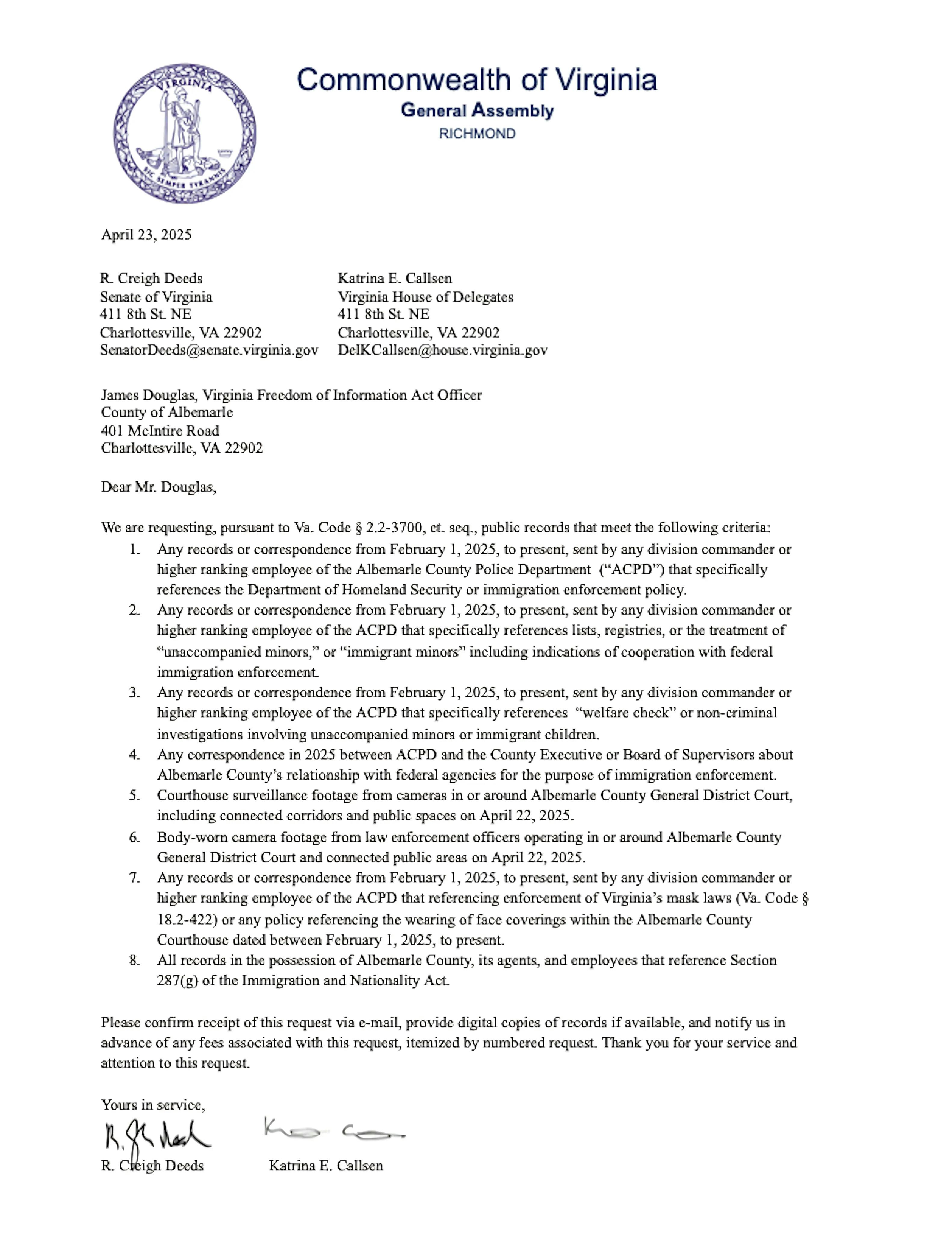 Charlottesville, VA – In a letter addressed to the Albemarle County FOIA Officer, Charlottesville-area legislators Senator Creigh Deeds and Delegate Katrina Callsen hope to find answers in response to concerns raised by plain-clothed Department of Homeland Security activity at the Albemarle County Courthouse. The text of the letter which outlines the Virginia Freedom of Information Act request can be found here: